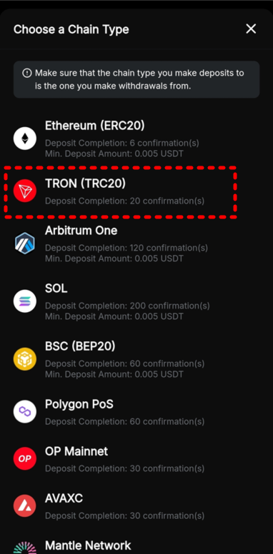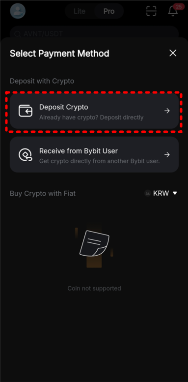 먼저 바이비트 앱을 실행한 뒤, 상단 메뉴에서 Deposit(입금) → Crypto → USDT를 선택합니다. 이후 네트워크를 TRON(TRC20)으로 지정하면 입금에 사용할 지갑 주소가 표시됩니다.