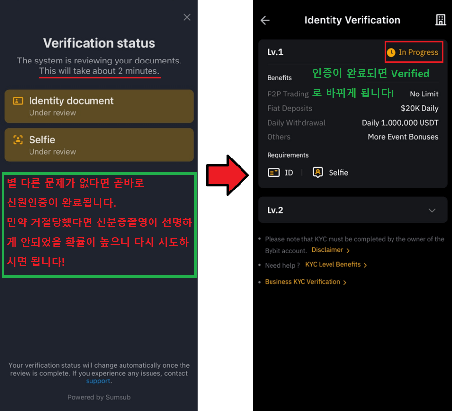 대부분의 경우 몇 분 안에 KYC 인증이 승인됩니다. 만약 거절될 경우, 신분증이 흐릿하게 찍혔거나 조명이 반사된 경우가 많으니 다시 한번 선명하게 촬영해 재시도하면 됩니다