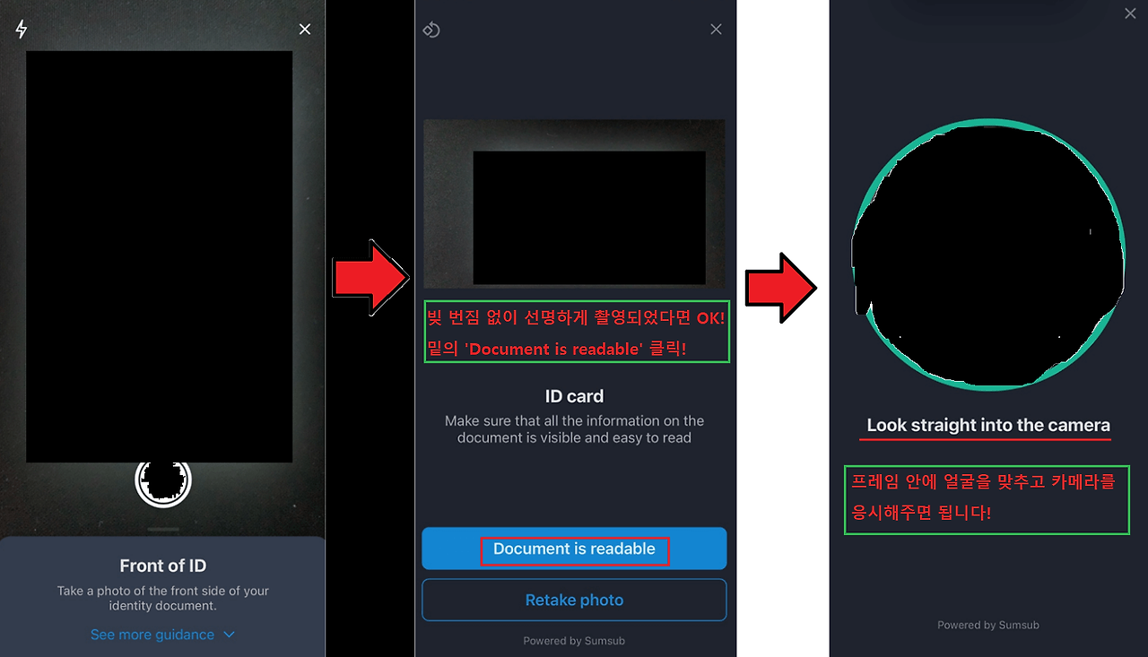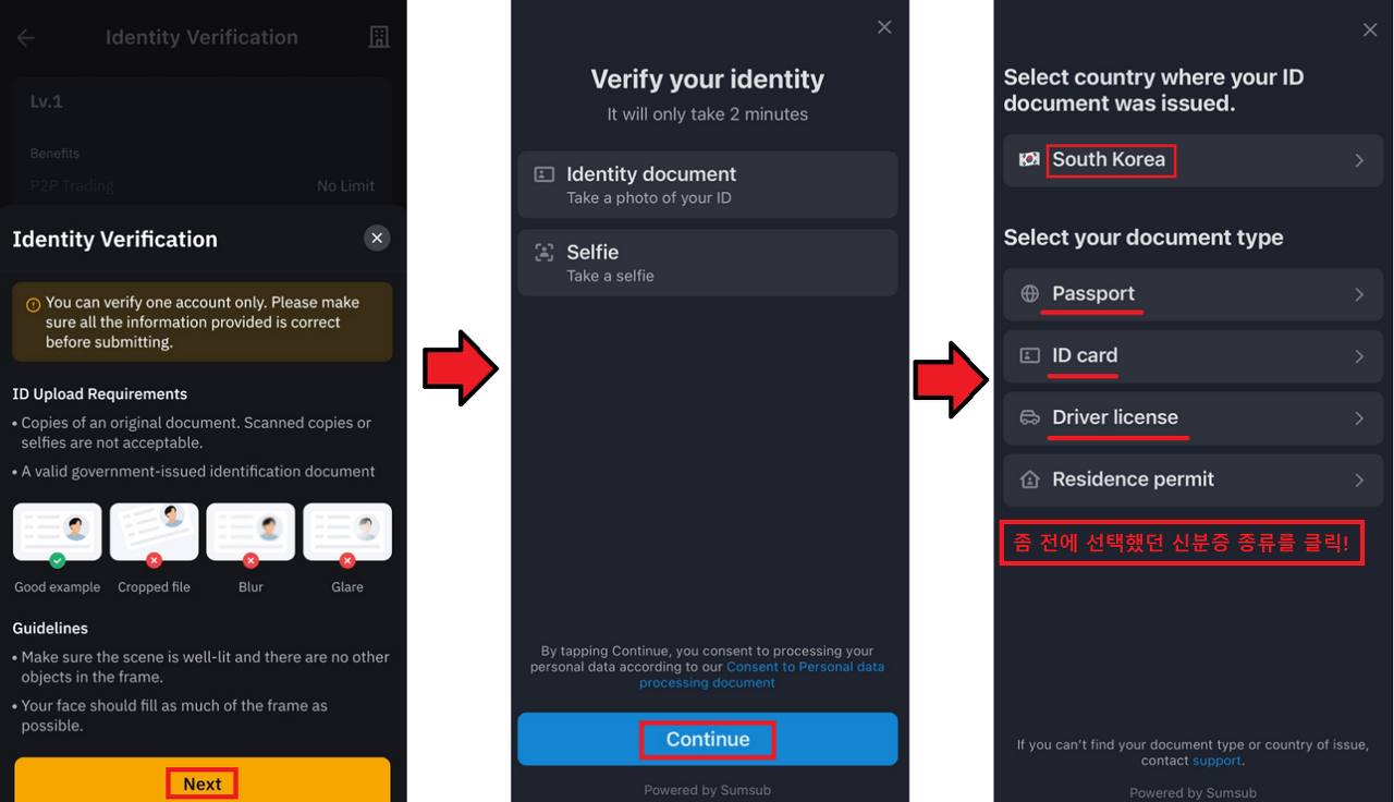 이후 화면 안내에 따라 빛 반사 없이 선명하게 신분증을 촬영해 주세요. ‘Next’를 눌러 국적을 South Korea로 선택한 뒤, 앞서 고른 신분증 종류를 다시 확인하면 됩니다.