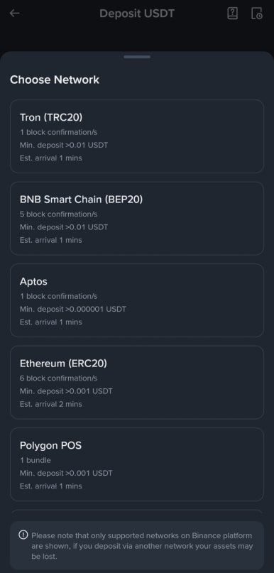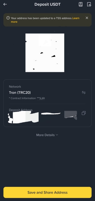 검색창에서 USDT를 입력하면 여러 네트워크가 나오는데, 여기서 Tron(TRC20)을 선택하는 것이 일반적입니다. Tron 네트워크는 전송 속도가 빠르고 수수료가 거의 들지 않아 가장 많이 사용됩니다. 네트워크를 선택하면 QR코드와 함께 입금 주소가 나타납니다. 주소 옆의 복사 버튼을 눌러 입금 주소를 복사해 둡니다.