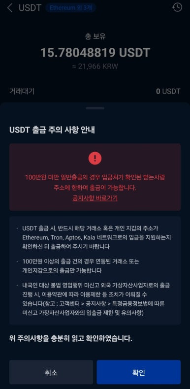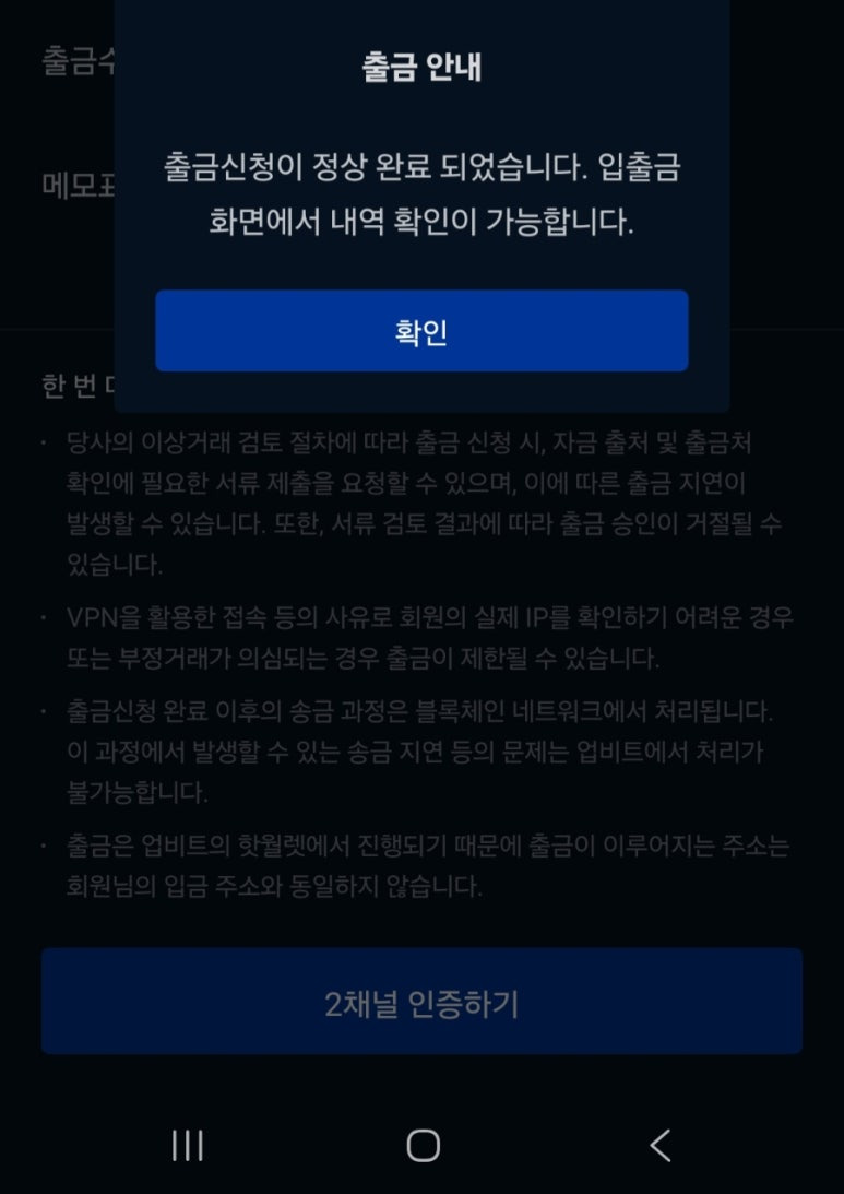 확인 버튼을 누르면 보안 인증 절차(2채널 인증)가 한 번 더 진행되며, 출금 신청이 완료됩니다. 잠시 후 업비트에서는 “출금 완료” 알림이 오고, 바이낸스 앱에는 “입금 중” 알림이 뜹니다. 몇 분 정도 기다리면 바이낸스 지갑의 Spot 계정에 USDT가 정상적으로 입금된 것을 확인할 수 있습니다.