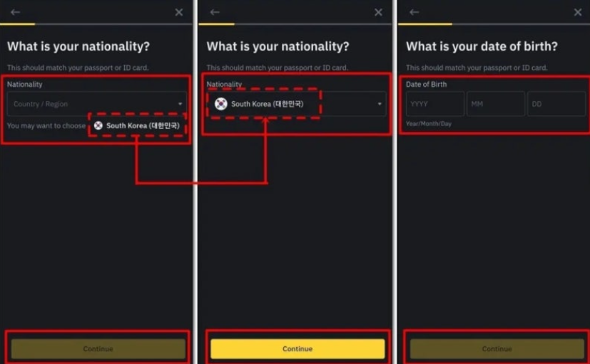 다음으로 국가를 다시 한 번 확인하는 단계와 생년월일 입력 절차가 이어집니다. 국가 항목은 ‘South Korea’를 선택하면 자동으로 입력되며, 생년월일은 안내에 따라 순서대로 입력하면 됩니다.