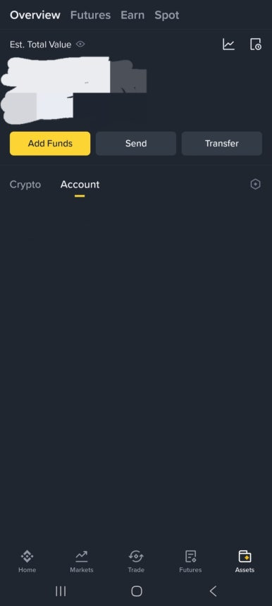 먼저 바이낸스 앱을 실행합니다. 화면 하단에는 Home, Markets, Trade, Futures, Assets 메뉴가 있는데, 여기서 Assets를 눌러주세요. 상단의 Add Funds(입금하기) 버튼을 누르면 입금 방식 선택 화면이 나타납니다. 우리는 업비트에서 바이낸스로 코인을 보내는 것이므로 On-Chain Deposit을 선택합니다.