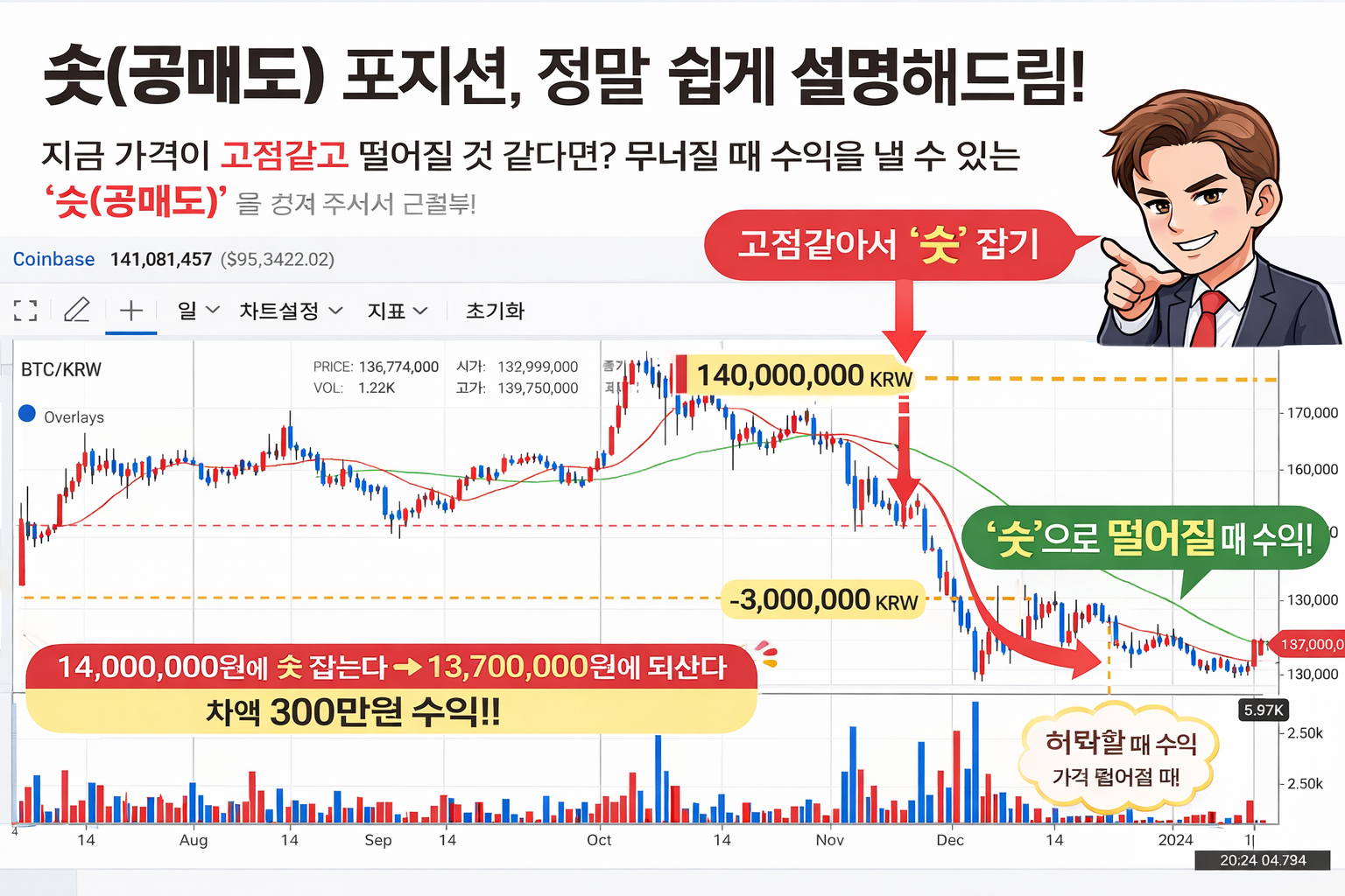 이후 비트코인 가격이 1억 3천7백만 원까지 하락했을 때 다시 매수하여 포지션을 종료하면, 300만 원의 차익이 발생합니다. 이처럼 숏은 가격이 하락하는 구간에서도 수익을 낼 수 있는 거래 방식입니다.